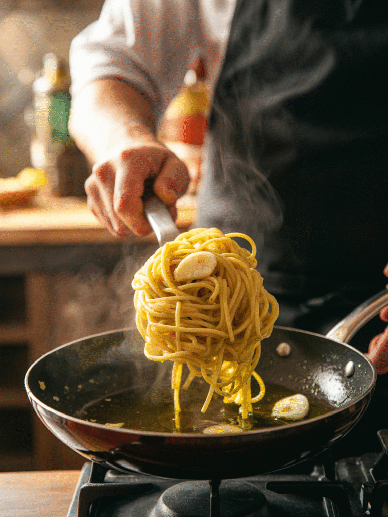 Mit nur drei Hauptzutaten – Knoblauch, Olivenöl und Pasta – entsteht ein Gericht, das sowohl Gourmet als auch Familienliebling ist.