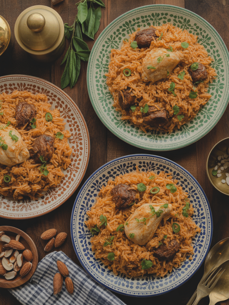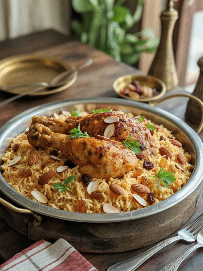 Das Gericht ist ein echter Klassiker der arabischen Hausmannskost: zarter Reis, goldbraunes Hähnchen und fein abgestimmte Gewürze, die jeden Bissen besonders machen.