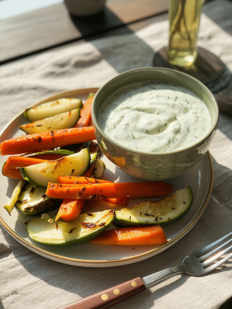 Knusprig geröstetes Gemüse aus dem Ofen, das duftet nach frischen Kräutern und Sommer – dazu ein cremiger Joghurt-Dip, der alles harmonisch verbindet.