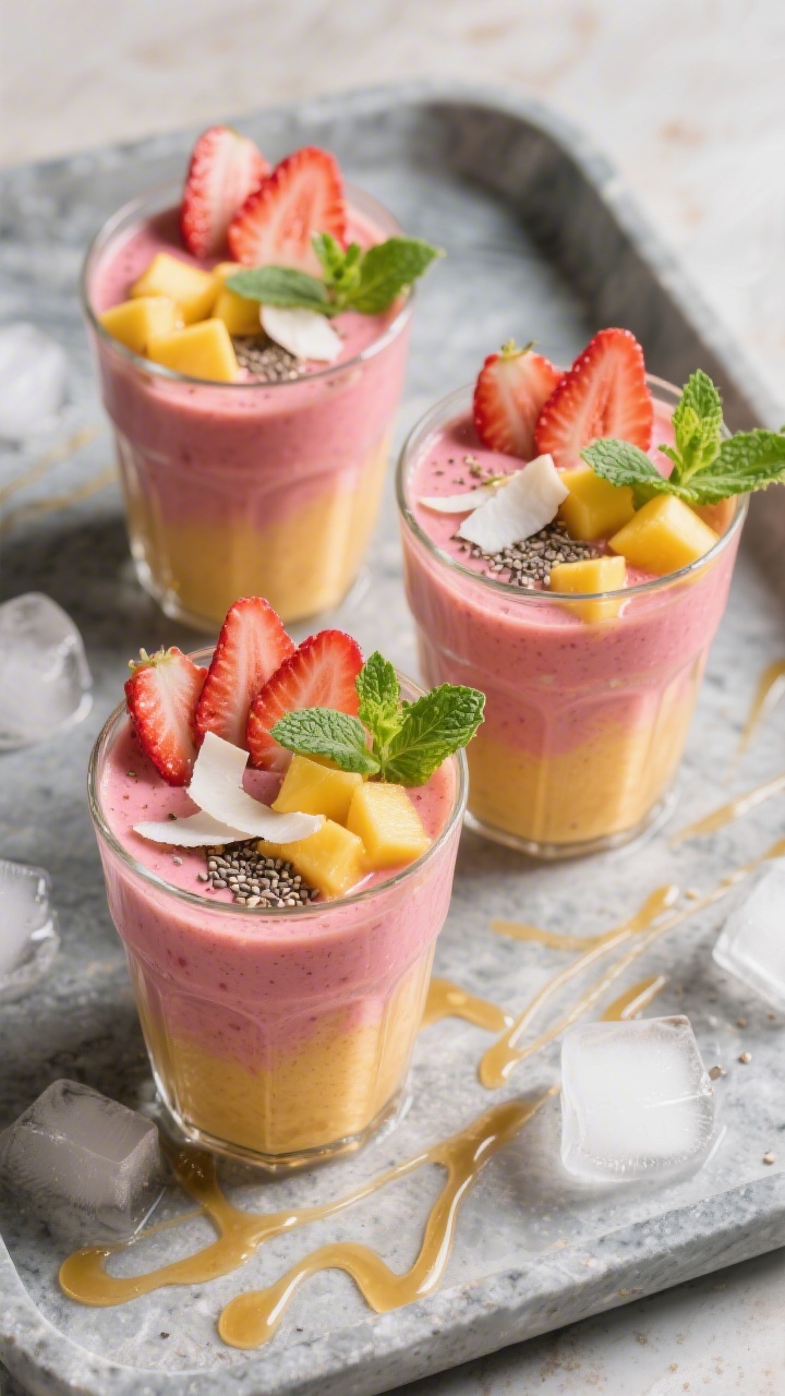 - Sofort servieren: In gekühlte Gläser füllen und nach Wunsch mit Erdbeerscheiben, Mangowürfeln oder Minze garnieren.
