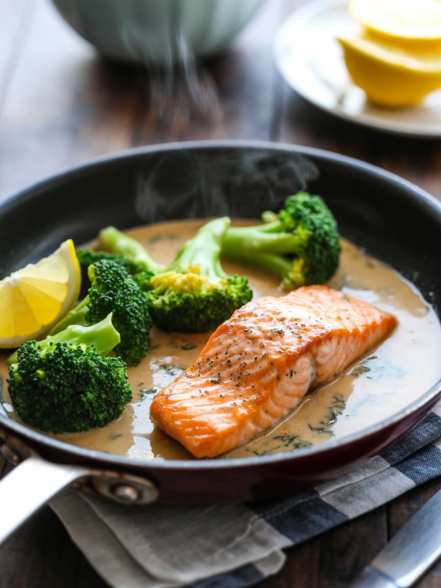 Gebratener Lachs mit Brokkoli & Zitronensauce vereint saftigen Fisch, frisches Gemüse und eine samtige Sauce mit feiner Zitrusnote – perfekt für einen schnellen Feierabend oder das gesunde Mittagessen.