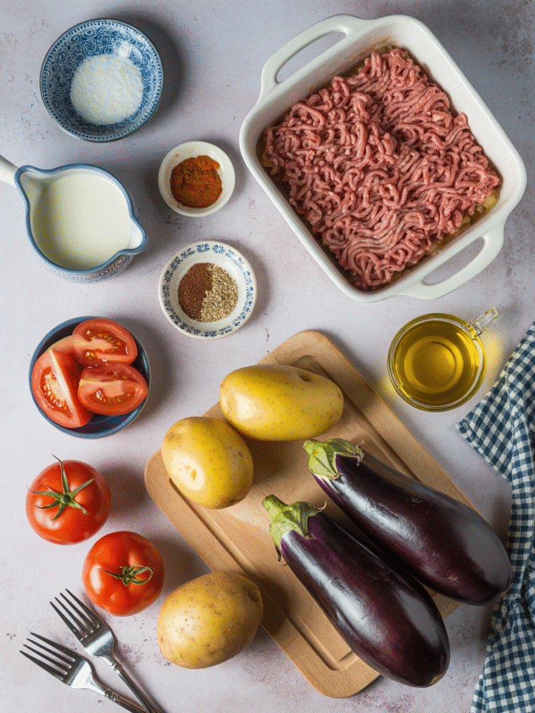 In einer Auflaufform: Kartoffeln → Auberginen → Hackfleisch → Béchamelsauce.