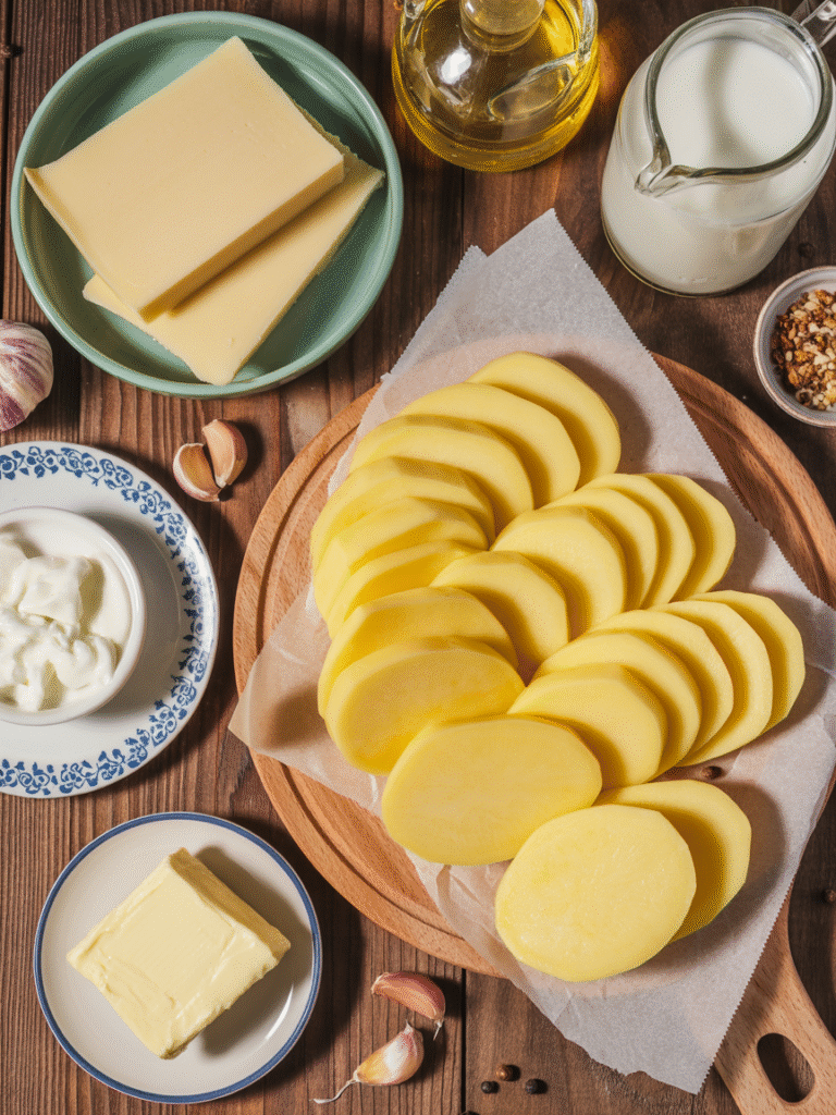 - Kartoffeln: Schälen, in dünne Scheiben (ca. 2–3 mm) schneiden.