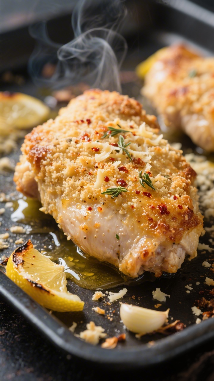 Knoblauch-Parmesan-Hähnchen aus dem Ofen ist ein unkompliziertes, aromatisches Gericht mit knuspriger Kruste und saftigem Inneren. Die Zutaten sind günstig, die Zubereitung schnell, und die Ergebnisse überzeugen jedes Mal. Mit ein paar einfachen Kniffen – trockentupfen, gut würzen, Panade fest andrücken – gelingt es garantiert.