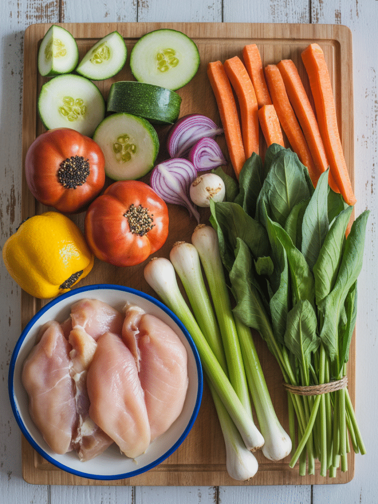 - Kurz schmoren: 5–6 Minuten, bis das Gemüse bissfest ist.