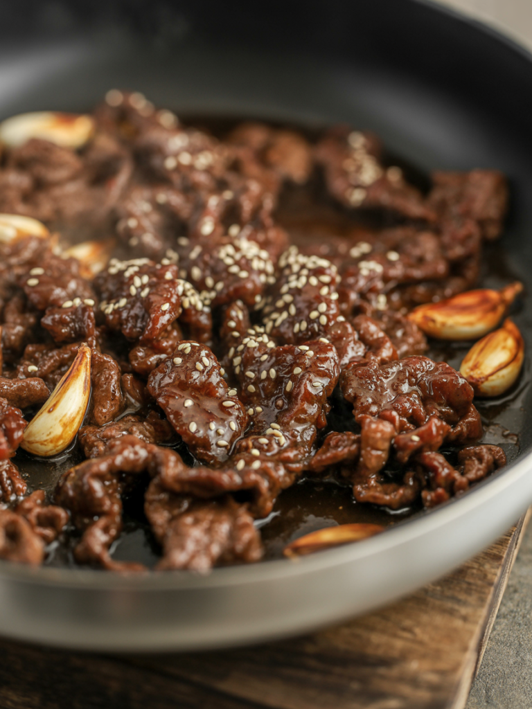 Das Herzstück ist das würzig marinierte Rindfleisch, das kurz und heiß angebraten wird. Dazu kommt eine Sauce, die süßliche Noten mit Umami verbindet. Kombiniert mit Reis und frischen Komponenten entsteht ein Gericht, das ausgewogen wirkt und trotzdem richtig Lust auf den nächsten Bissen macht.